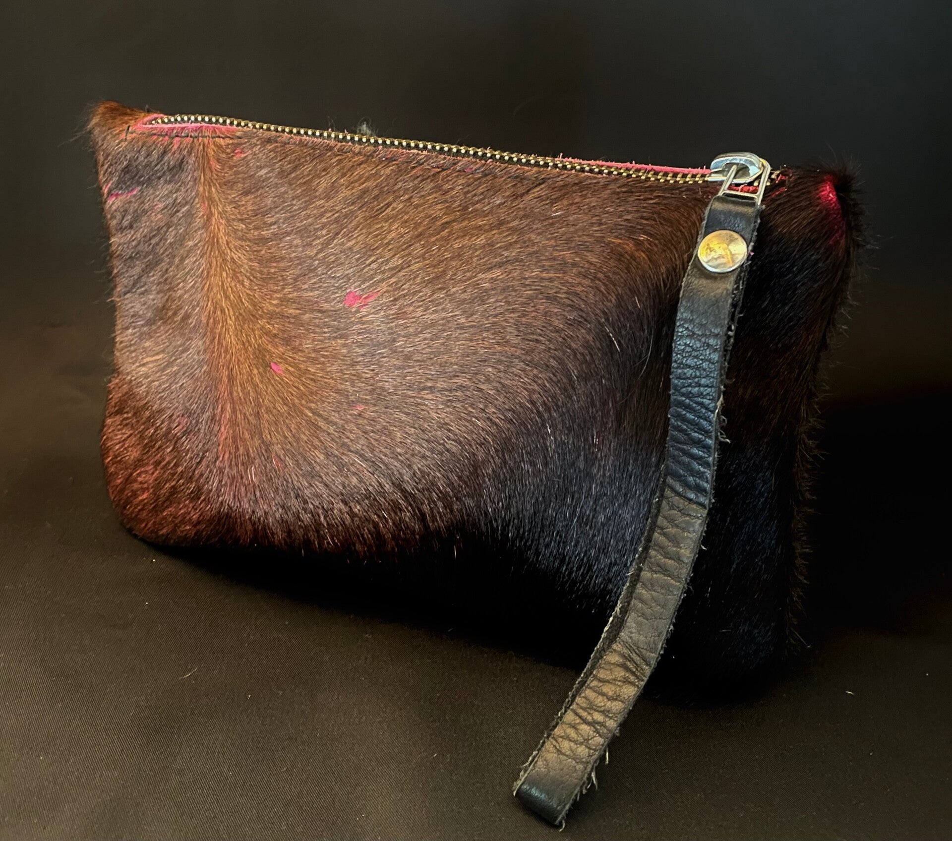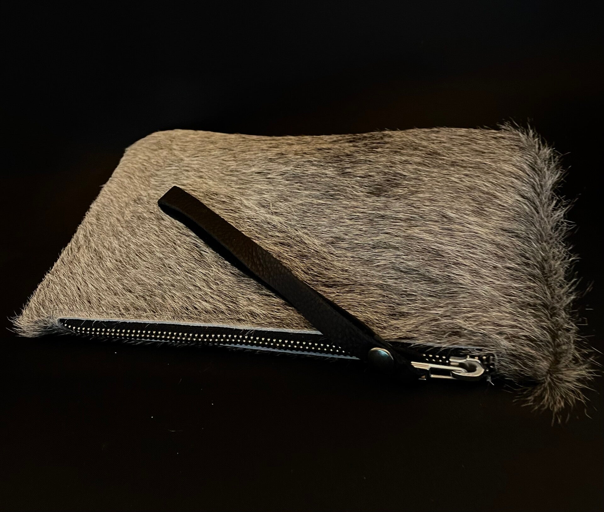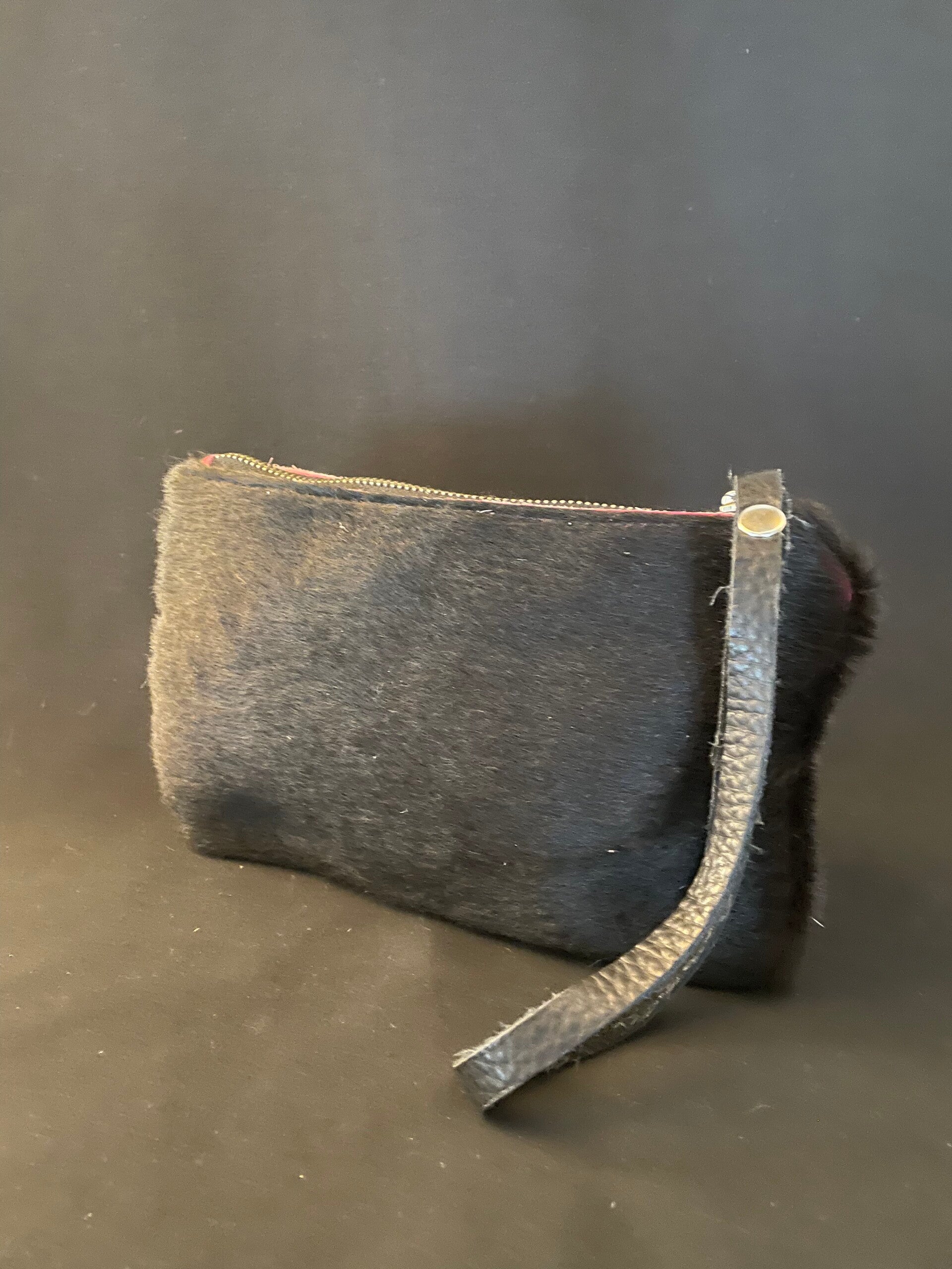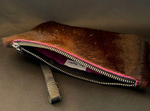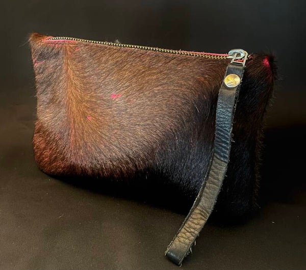 Natuurlijke koeienhuid clutches. Sluiten met een rits & aan de rits is een polsbandje bevestigd. Maat:+-23x14
