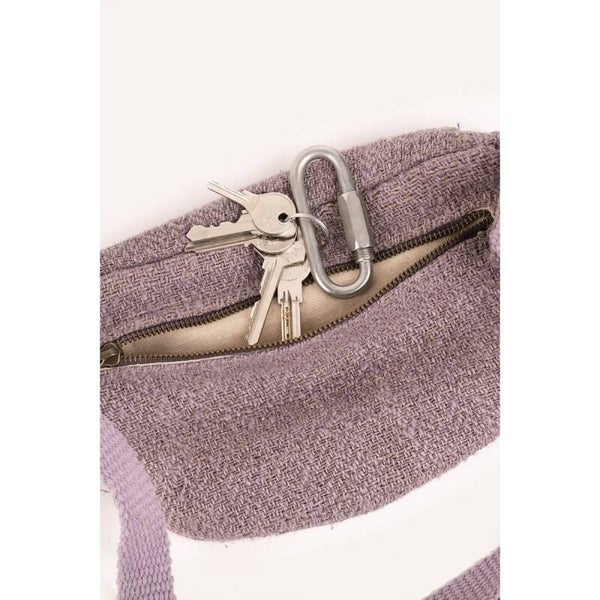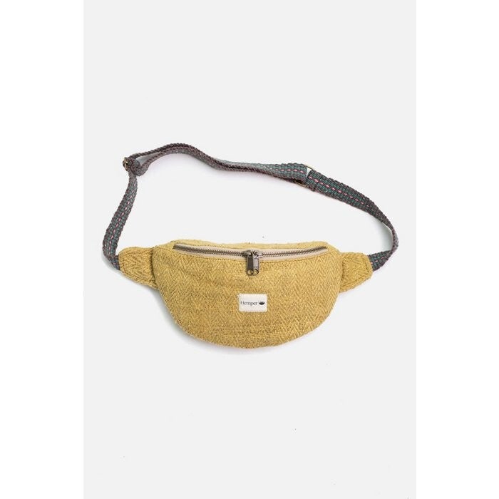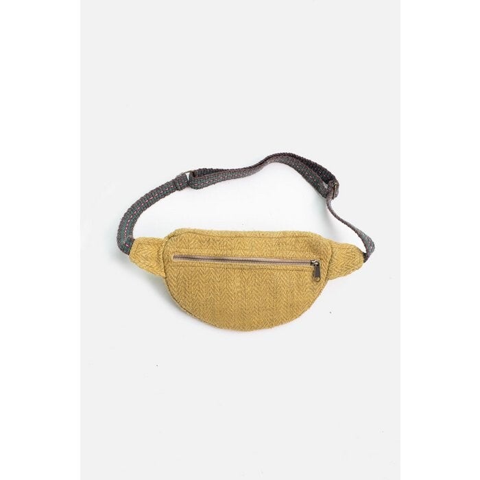 Plantaardige 100% geverfde hennepstof gemaakt in de weefgetouwen van Mohan. De heuptas is handgemaakt in het atelier van Rawal.
