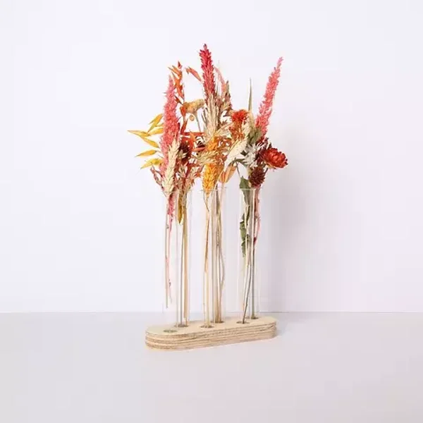 Deze houten bloemenhouder wordt in een mooi doosje inclusief 6 glazen vaasje geleverd.
