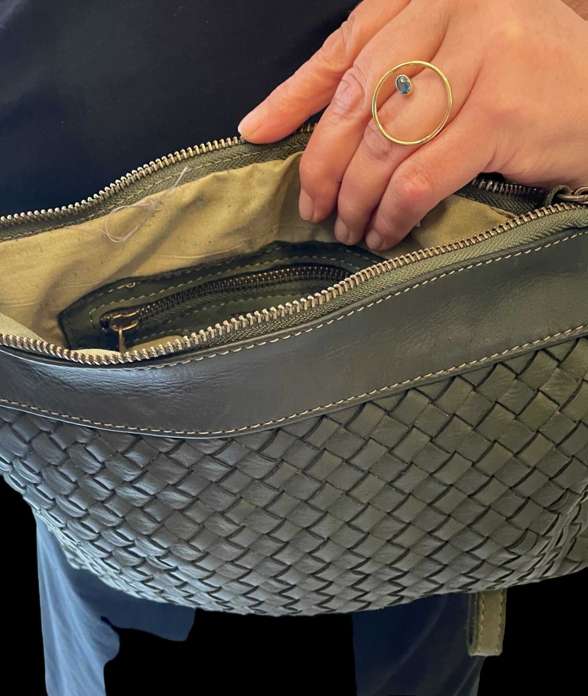 Handtas in soepel zacht leder met verstelbare riem.
