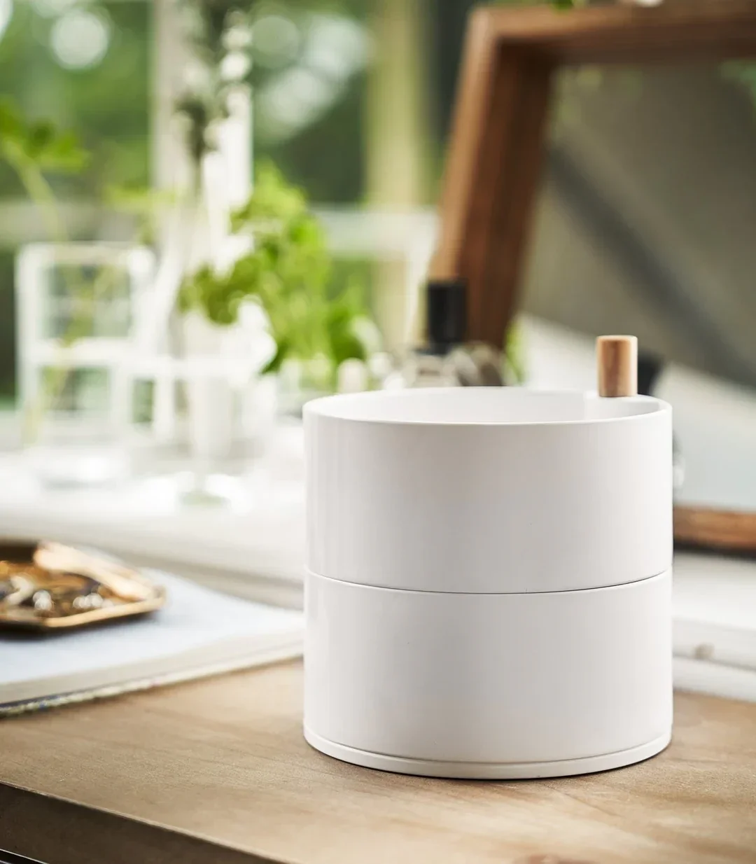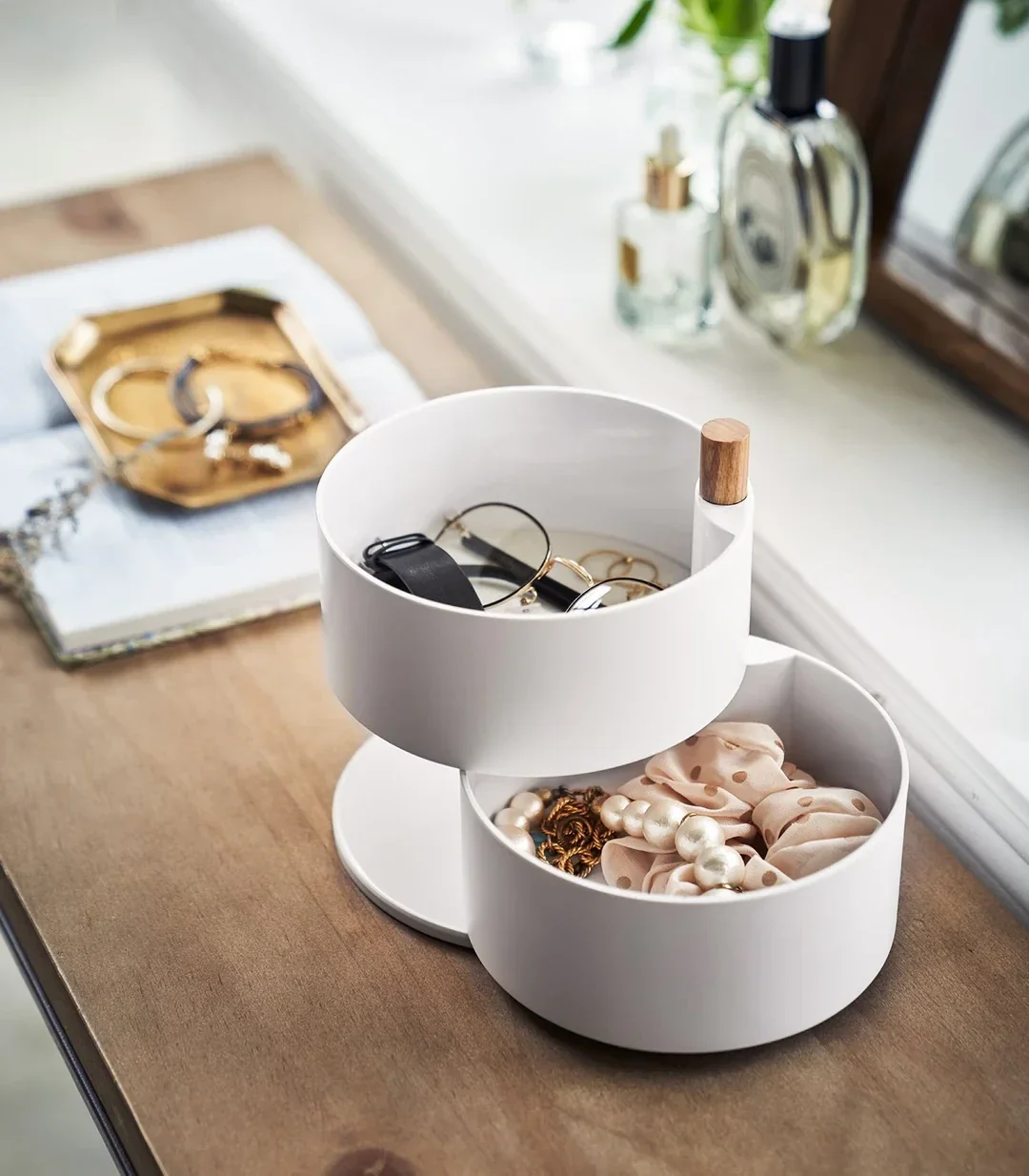 Deze eenvoudige accessoiretoren heeft twee compartimenten die rond een houten as draaien, waardoor de inhoud georganiseerd en beschermd blijft. Het bovenste compartiment heeft geen deksel, perfect voor uw dagelijkse benodigdheden.