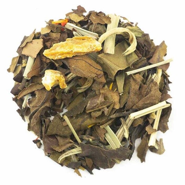Ingrediënten: Bai Mu Dan witte thee, limoenaroma, citroengras, citroenschil, saffloerblaadje, goudsbloemblaadje.