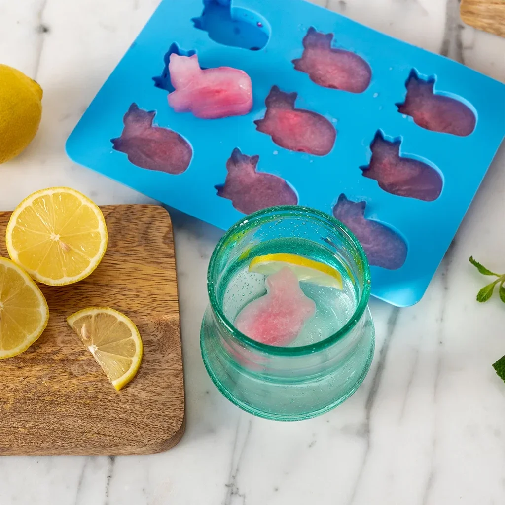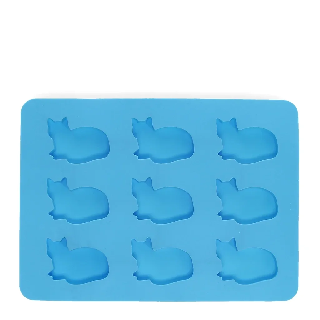 Rectangular ice cube tray in blue, with cat-shaped slots. Perfect for adding fun and unique cooling to drinks during the hot summer months or at parties.
