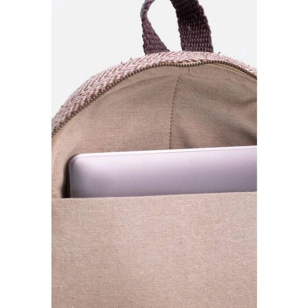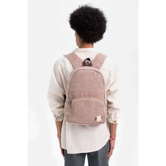 Handgenaaide hennep & katoenen rugzak. De rugzak heeft een buitenvak en een binnenvak voor computers tot 13".